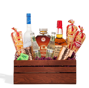 Is it just us, or does everything taste better in a copper mug? This BroBasket has the liquor, two branded copper mugs, two bottles of Fever-Tree ginger beer (a must-have for mixing the perfect mule), and two fresh limes. So it’s more than just a Grey Goose gift; it’s gifting with purpose.