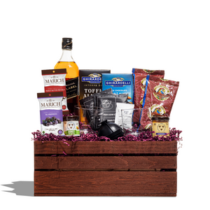 For this unique gift we start with a reusable BroBasket crate – rustic, useful, and totally versatile. We stuff in a 750ml bottle of Johnnie Walker Black Label Scotch – who doesn’t love that? – a few packages of Copper Cow and Caribbean Coffee, and two bottles of Fool’s Gold honey to sweeten that coffee the natural way. And we don’t stop there. We include two packages of Godiva chocolate covered nuts and two Godiva chocolate bars – perfect for sharing with coworkers or hoarding all to himself (if that’s the kind of guy he is).