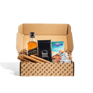 A Spanish cedar-lined leather cigar case, three cigars, a torch lighter, a cigar cutter, a 9-piece set of whisky stones with a pouch, and a Ghirardelli chocolate bar make it worthwhile. The perfect curated gift? Yes, indeed.